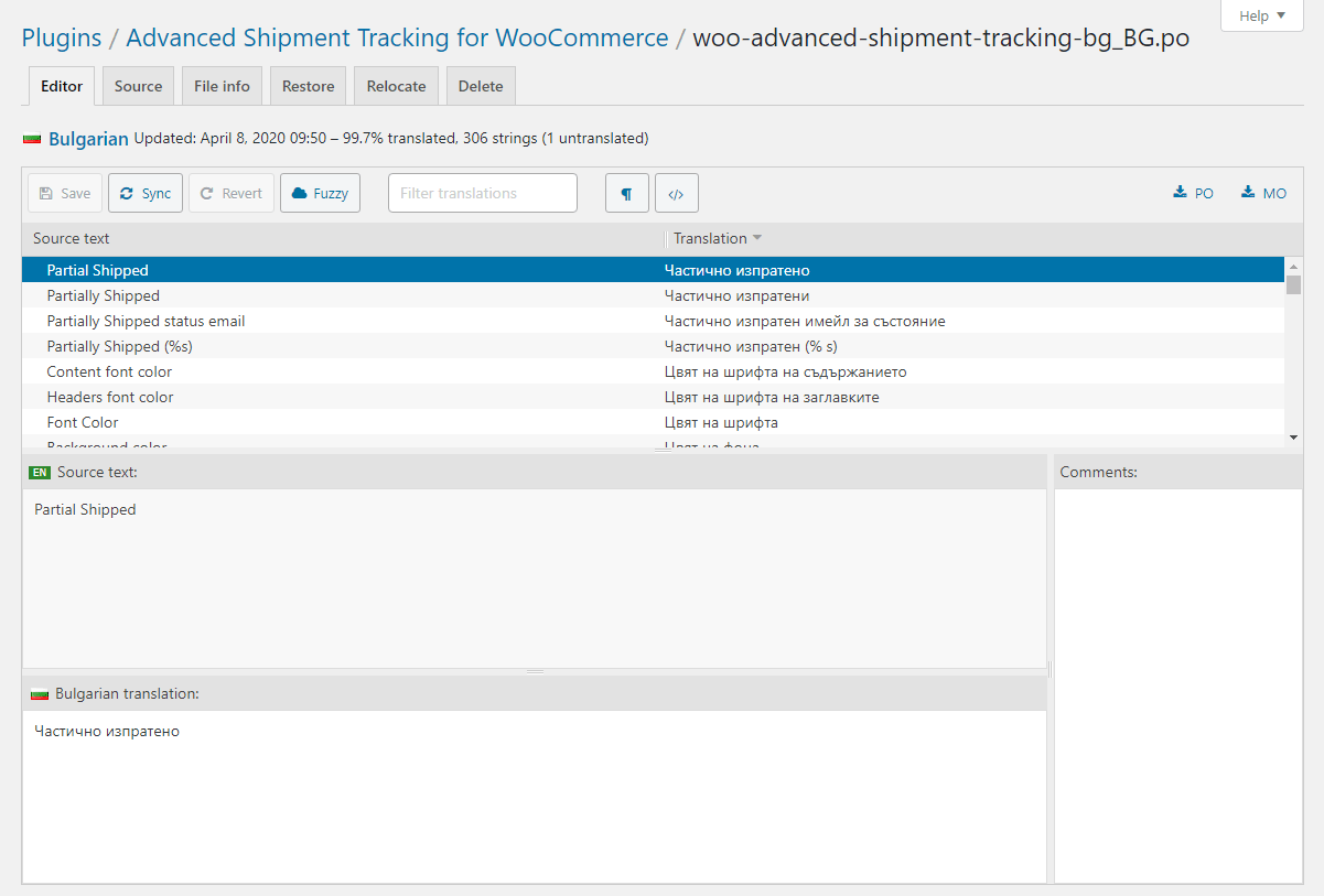 f you translated the Advanced Shipment Tracking plugin to your language and would like us to include your language or the updated translations in the plugin, you can submit the translation files (po/mo):